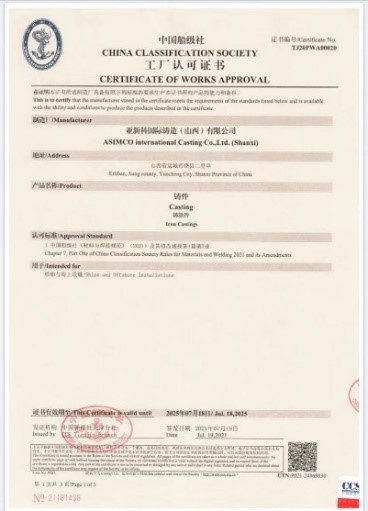 2021年5月,公司加快了CCS工厂认可步伐,进入了现场抽样审核阶段。审核中,中国船级社验船师通过查阅文件、现场提问、现场抽检等方式,对亚新科山西灰铸铁产品和球墨铸铁产品的生产过程、实验室操作环境、检测设施状况、检测标准等进行逐一检查,并随机抽取样品进行检测;通过严格的现场审核,验船师对公司产品质量控制的软硬件条件给予了充分的肯定。经审查,验船师认为产品质量控制体系运行有效,生产及检测设备齐全,检测技术先进,样品检测过程及结果符合试验大纲及中国船级社《材料与焊接规范》相关要求,并于7月19日颁发了CCS工厂认可证书。有效期为4年,每年需进行年审。中国船级社是国家船舶技术检验机构,也是中国从事船舶入级检验业务的权威机构。