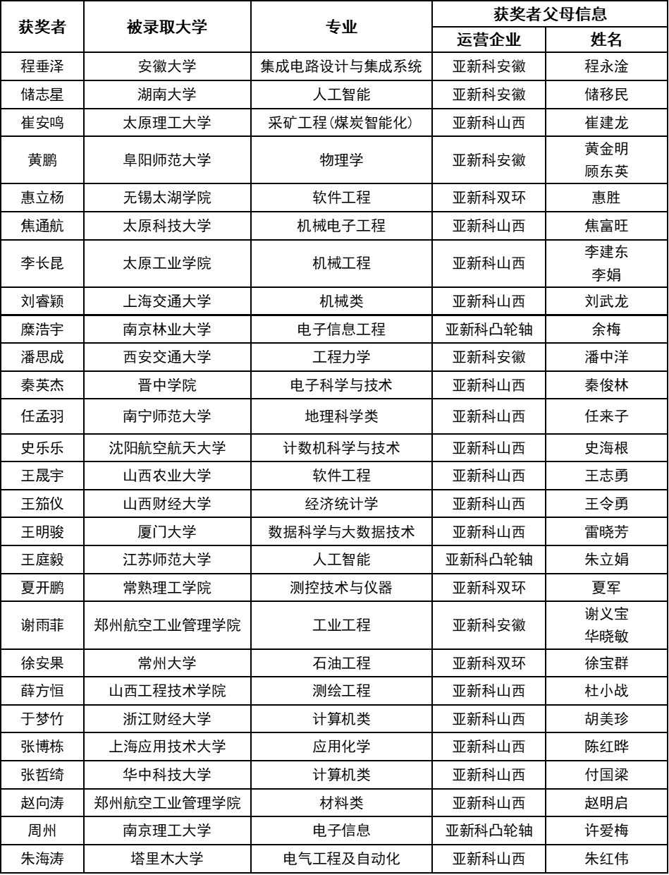 经过对候选者的高考成绩、录取专业与亚新科业务的关联程度、对奖学金的需求程度、申请人意愿等诸多方面进行了综合考量和评定,今年,亚新科集团管理层成员一致决定:由各家运营公司提交的27名候选人全部获得2022年度李克平奖学基金,获奖者名单如下(按姓氏排序):