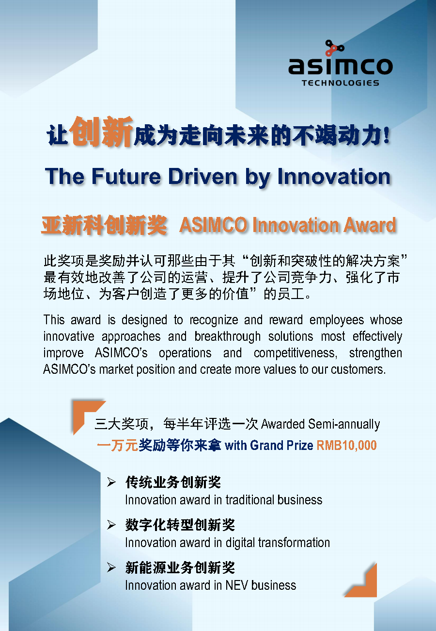 本次三大创新奖的评选,共收到28个创新项目,其中已经获得专利的项目12个。以先进性(是否拥有专利)、经济性(经济效益的规模)、实用性(量产应用;以及通过实施数字化、智能化、自动化为企业提升效率)为主要衡量指标,最终评选出以下四个项目。其中,在传统业务创新奖项中,有两个项目都非常优秀,评审团队决定增加一个获奖项目。正如在重启创新奖评选活动时所言:“打造创新型企业,崇尚创新的企业文化,是亚新科集团再启‘创新奖’的意义所在。” 我们希望通过这个评选活动进一步激发亚新科全员的创新意识,形成创新的企业氛围。