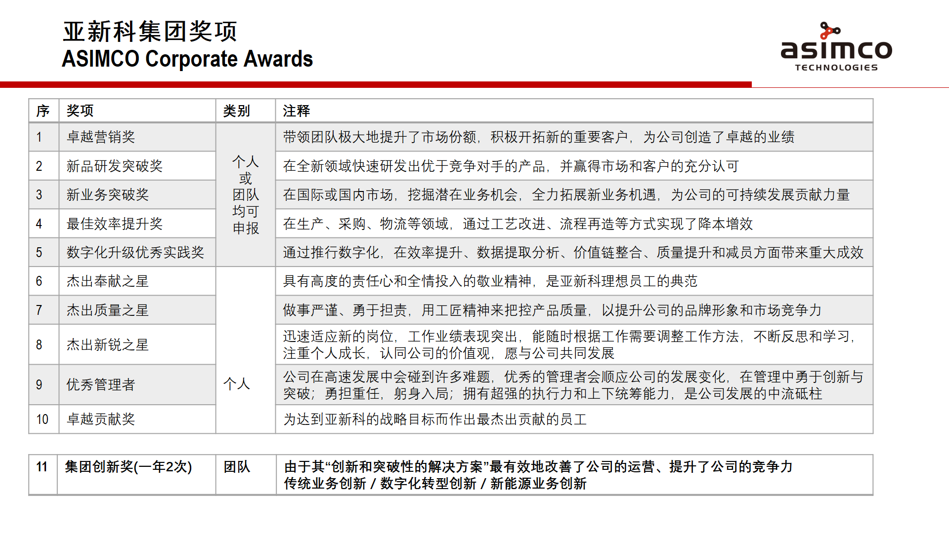 亚新科集团发布年度奖项设置与评选活动。奖项的设置旨在激活所有员工积极上进、攻坚克难的精 神;鼓舞所有员工的工作热情和创新精神;提升所有员工的工作效率,践行集团核心价值观。更是感谢这些天道酬勤、无私奉献的员工们。